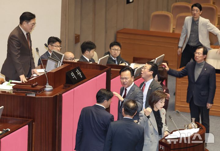 [서울=뉴시스] 조성봉 기자 = 나경원 국민의힘 의원이 9일 서울 여의도 국회에서 열린 제429회국회(정기회) 제16차 본회의에서 가맹사업거래의 공정화에 관한 법률 일부개정법률안에 대한 필리버스터를 하던 중 의제와는 관련없는 발언을 이어가자 여야 의원들이 나와 언쟁을 벌이고 있다. 2025.12.09. [email protected]