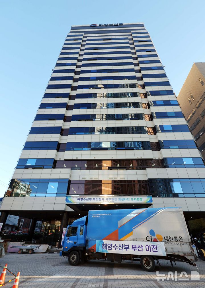 [부산=뉴시스] 하경민 기자 = 해양수산부가 세종에서 부산 동구 IM빌딩(본관)·협성타워(별관) 임시청사로 단계적 이전을 시작한 가운데 9일 첫 이삿짐을 실은 차량이 부산 본관 건물로 들어서고 있다.