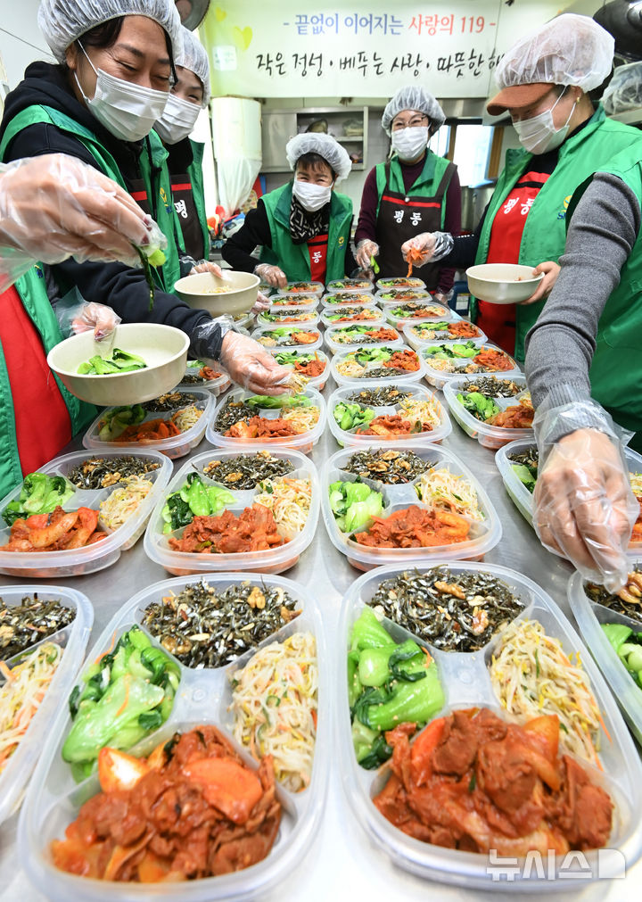 [수원=뉴시스] 김종택 기자 = 9일 경기 수원시 권선구 평동 행정복지센터에서 새마을 부녀회 회원들이 관내 독거노인 등 취약계층에 전달할 반찬을 만들어 용기에 담고 있다. 2025.12.09. [email protected]