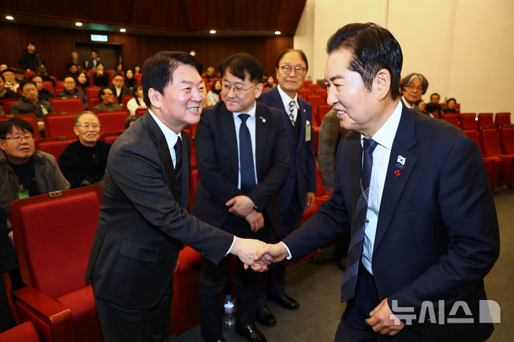 [서울=뉴시스] 김명년 기자 = 정청래 더불어민주당 대표가 9일 오전 서울 여의도 국회 도서관 대강당에서 열린 '2025 대한민국 한센인대회'에서 안철수 국민의힘 의원과 악수하고 있다. 2025.12.09. [email protected]