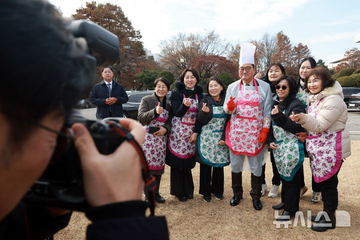 [서울=뉴시스] 고승민 기자 = 우원식 국회의장이 9일 서울 여의도 헌정회관 앞에서 열린 '국회 생생텃밭과 함께하는 김장나눔' 행사에서 참가자들과 기념촬영하고 있다. 2025.12.09. [email protected]
