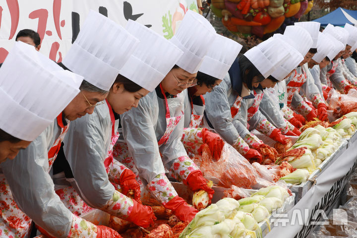 [서울=뉴시스] 고승민 기자 = 백혜련 국회 생생텃밭 회장 등 의원들과 참석자들이 9일 서울 여의도 헌정회관 앞에서 열린 '국회 생생텃밭과 함께하는 김장나눔' 행사에서 배추에 양념을 넣고 있다. 2025.12.09. [email protected]