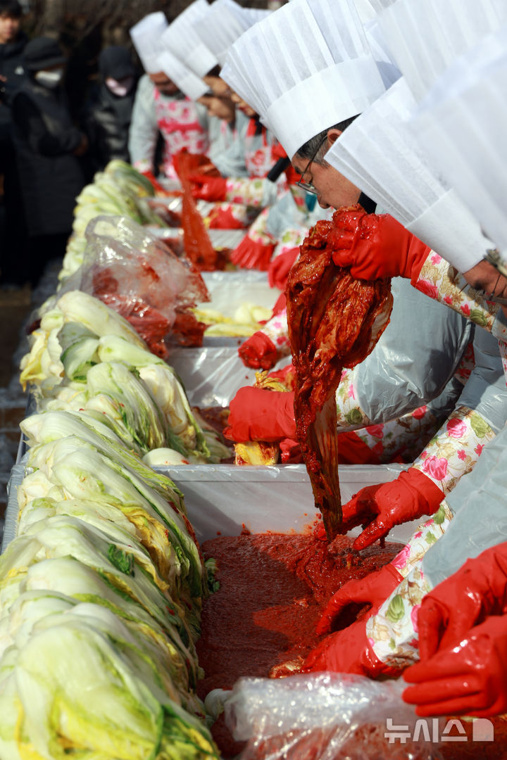 [서울=뉴시스] 고승민 기자 = 백혜련 국회 생생텃밭 회장 등 의원들과 참석자들이 9일 서울 여의도 헌정회관 앞에서 열린 '국회 생생텃밭과 함께하는 김장나눔' 행사에서 배추에 양념을 넣고 있다. 2025.12.09. [email protected]