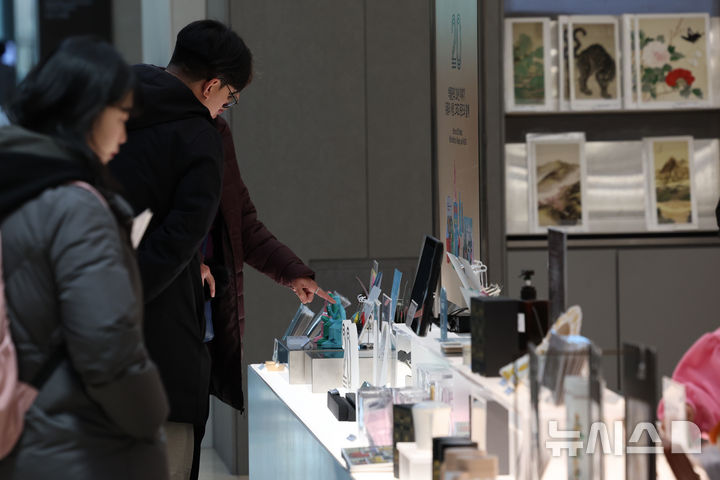 [서울=뉴시스] 조성우 기자 = 국립중앙박물관을 찾은 관람객이 처음으로 600만 명을 돌파할 것으로 전망된 가운데 9일 서울 용산구 국립중앙박물관 상설전시관 기념품점에서 관람객들이 박물관 문화상품 '뮷즈'를 살펴보고 있다.