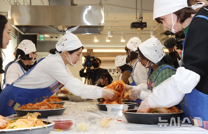 [서울=뉴시스] 고범준 기자 = 김혜경 여사가 9일 서울 종로구 북촌 한식문화공간 이음에서 열린 주한대사 배우자 초청 김장 행사에서 주한 외국대사 배우자들과 함께 김치를 담그고 있다. 2025.12.09. [email protected]