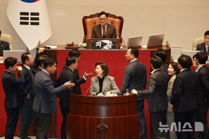 [서울=뉴시스] 고승민 기자 = 나경원 국민의힘 의원이 9일 서울 여의도 국회에서 열린 제429회국회(정기회) 제16차 본회의에서 가맹사업거래의 공정화에 관한 법률 일부개정법률안에 대한 필리버스터를 하던 중 의제와는 관련없는 발언을 이어가자 여야 의원들이 나와 언쟁을 벌이고 있다. 2025.12.09. [email protected]