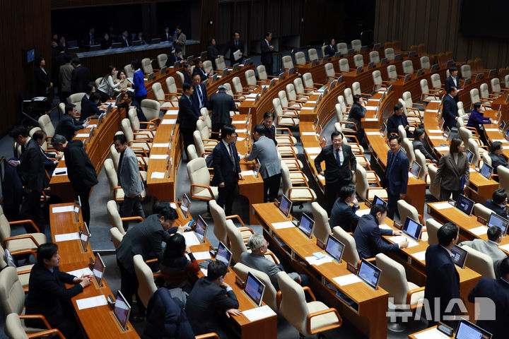 [서울=뉴시스] 고승민 기자 = 나경원 국민의힘 의원이 9일 서울 여의도 국회에서 열린 제429회국회(정기회) 제16차 본회의에서 가맹사업거래의 공정화에 관한 법률 일부개정법률안에 대한 필리버스터를 시작하자 더불어민주당 등 의원들이 회의장을 나가고 있다. 2025.12.09. [email protected]