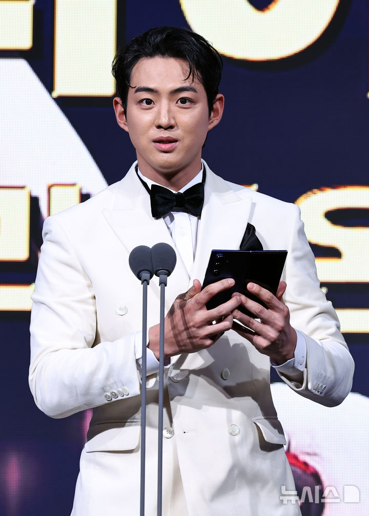 [서울=뉴시스] 최진석 기자 = 삼성 라이온즈 구자욱이 9일 서울 송파구 롯데호텔 월드에서 열린 '2025 KBO 골든글러브 시상식'에서 삼성 르윈 디아즈의 1루수 골든글러브를 대리 수상 후 전달받은 소감을 밝히고 있다. 2025.12.09. [email protected]