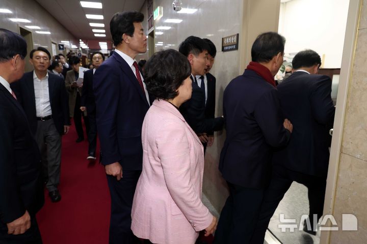 [서울=뉴시스] 조성봉 기자 = 송언석 국민의힘 원내대표와 중진의원들이 9일 오후 서울 여의도 국회에서 열린 제429회국회(정기회) 제16차 본회의 정회와 관련해 국회의장실을 항의방문하고 있다. 2025.12.09. [email protected]