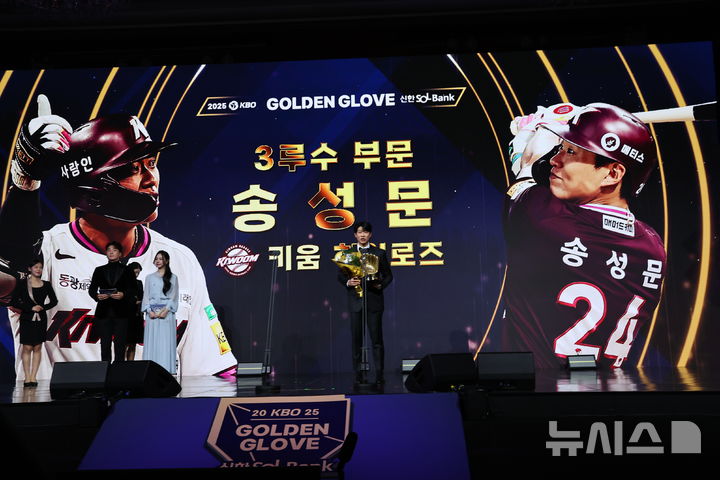 [서울=뉴시스] 최진석 기자 = 키움 히어로즈 송성문이 9일 서울 송파구 롯데호텔 월드에서 열린 '2025 KBO 골든글러브 시상식'에서 3루수 골든글러브를 수상 후 소감을 밝히고 있다. 2025.12.09. [email protected]
