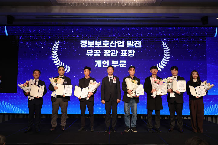 [서울=뉴시스] 정병혁 기자 = 배경훈 부총리 겸 과학기술정보통신부 장관이 9일 오후 서울 강남구 노보텔앰배서더호텔에서 열린 '2025 정보보호산업인의 밤' 에서 수상자들과 기념촬영을 하고 있다.(사진=과학기술정보통신부 제공) 2025.12.09. [email protected] *재판매 및 DB 금지
