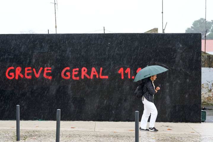 [리스본=AP/뉴시스] 9일(현지 시간) 포르투갈 리스본에서 한 여성이 '총파업'이라고 적힌 벽화 옆을 지나가고 있다. 포르투갈 노동조합은 중도우파 정부가 발표한 새로운 노동 패키지에 항의해 11일 총파업을 예고했다. 2025.12.10.