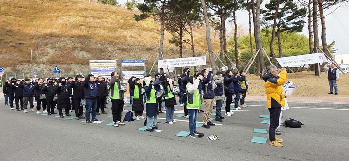 [태안=뉴시스] 김덕진 기자=10일 충남 태안화력발전소 비정규직 청년 노동자 김용균씨 사망 7주기를 맞아 김용균재단과 민주노총 세종충남본부 관계자들이 발전소 정문에서 추모제를 갖고 '일하다 죽지 않게! 차별받지 않게!', '위험의 외주화 금지! 죽음의 발전소를 멈춰라!' 등 구호를 외치고 있다. 2025.12.10. [email protected]