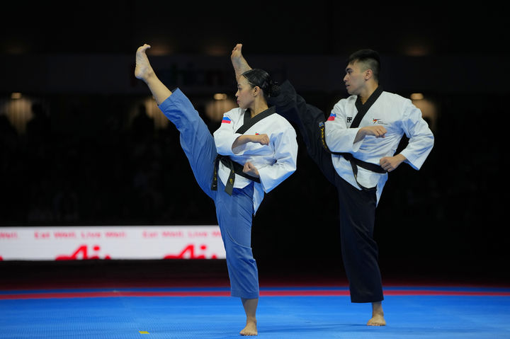 [방콕=AP/뉴시스] 10일(현지 시간) 태국 방콕에서 열리고 있는 제33회 동남아시안게임(SEA게임)에서 싱가포르 선수들이 태권도 품새 혼성 경기를 치르고 있다. 2025.12.10.