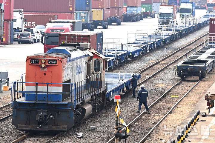 [의왕=뉴시스] 김종택 기자 = 전국철도노동조합 총파업을 하루 앞둔 10일 경기 의왕시 내륙컨테이너기지(ICD)에 화물열차가 정차해 있다.