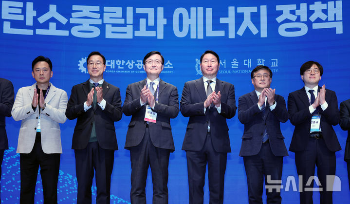 [서울=뉴시스] 조성우 기자 = 10일 오후 서울 중구 대한상공회의소에서 열린 제8회 탄소중립과 에너지 정책 세미나에서 최태원(왼쪽 네 번째부터) 대한상의 회장과 김성환 기후에너지환경부 장관, 위성곤(왼쪽 두 번째부터) 국회 기후위기특별위원회 위원장, 유홍림 서울대학교 총장 등 참석자들이 기념촬영하고 있다. 2025.12.10. [email protected]