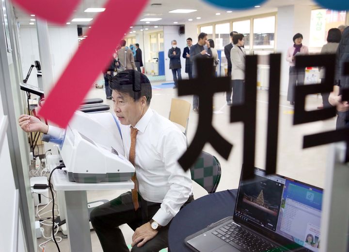 [서울=뉴시스] 황준선 기자 = 서강석 송파구청장이 10일 서울 송파보건소에서 열린 체력증진센터 개소식에 참석해 체력측정 기구(체성분 측정)를 시연 하고 있다. (사진=송파구 제공) 2025.12.10. [email protected]