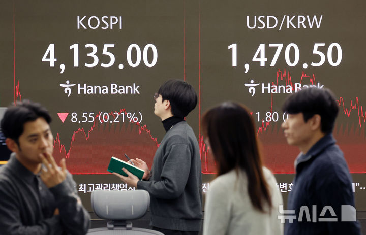 [서울=뉴시스] 조성우 기자 = 코스피가 전 거래일(4143.55)보다 8.55포인트(0.21%) 내린 4135.00에 장을 마감한 10일 오후 서울 중구 하나은행 딜링룸 전광판에 지수가 표시되고 있다.