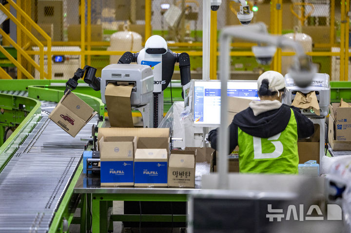 [군포=뉴시스] 정병혁 기자 = 지난 10일 경기 군포시 CJ대한통운 스마트풀필먼트센터에서 AI 휴머노이드 로봇이 완충재 보충, 박스 적재 등 포장 작업을 하고 있다. 2026.0109. [email protected]