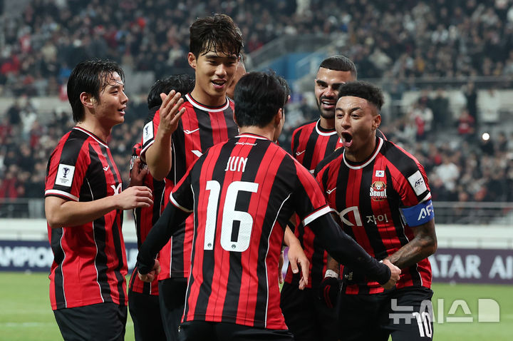 [서울=뉴시스] 김선웅 기자 = 10일 서울 마포구 서울월드컵경기장에서 열린 2025-2026시즌 아시아축구연맹(AFC) 챔피언스리그 엘리트(ACLE) 리그 스테이지 6차전 FC서울 vs 멜버른 시티 경기, FC서울 린가드가 골을 성공시킨 뒤 동료들과 기뻐하고 있다. 2025.12.10. [email protected]