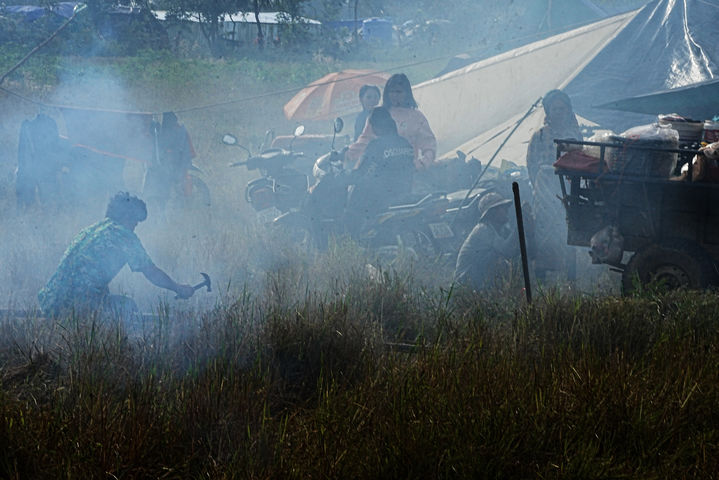 [오다르 메안체이=AP/뉴시스] 태국과 캄보디아의 국경 분쟁이 이어지는 가운데 11일(현지 시간) 캄보디아 오다르 메안체이주 주민들이 집을 떠나 논으로 대피해 텐트를 설치하고 있다. 2025.12.11.