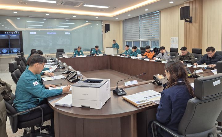 [영동=뉴시스] 11일 충북 영동군청 재난상황실에서 영동군과 영동소방서, 영동경찰서, 영동군문화관광재단, 한전, KT 등 7개 기관 대표자들이 ‘2025년 재난대비 상시훈련’을 진행하고 있다. 7개 기관은 화재 발생을 가정해 긴급구조통제단 가동, 현장 응급의료소 운영, 인명 구조·구급 활동 등을 수행했다. (사진=영동군 제공) 2025.12.11. [email protected]
