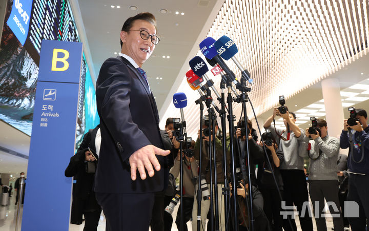 [인천공항=뉴시스] 조성우 기자 = 통일교로부터 금품을 수수했다는 의혹이 제기된 전재수 해양수산부 장관이 11일 오전 인천국제공항 제2여객터미널을 통해 귀국해 의혹 관련 입장을 밝히고 있다.