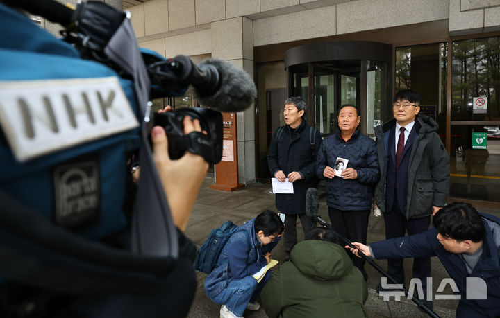 [서울=뉴시스] 최진석 기자 = 11일 서울 서초구 대법원에서 열린 일본제철을 상대로 제기한 강제동원 손해배상청구소송 상고심 판결을 마친 뒤 강제동원 피해자 정형팔 씨 유족(가운데)이 발언하고 있다. 이날 대법원 원고 일부승소로 판결한 원심을 확정했다. 2025.12.11. [email protected]