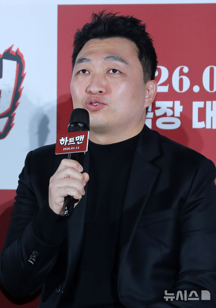 [서울=뉴시스] 김혜진 기자 = 최원섭 감독이 11일 오전 서울 광진구 롯데시네마 건대입구에서 열린 영화 '하트맨'(감독 최원섭) 제작보고회에서 인사말을 하고 있다. 2025.12.11. [email protected]