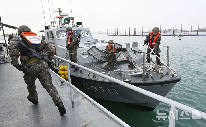 [화성=뉴시스] 김종택 기자 = 육군 제51사단 비전대대 장병들이 11일 경기 화성시 서해안 육군 경비정에서 해안경계를 위한 출동준비태세 훈련을 하고 있다. 2025.12.11. [email protected]