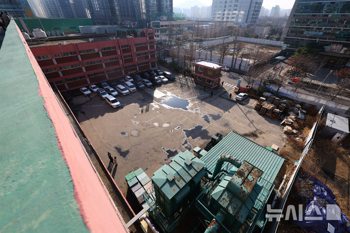 [서울=뉴시스] 황준선 기자 = 11일 오후 서울 금천구 G밸리G밸리 국가산업단지 내 특별계획구역 민간개발부지인 교학사 부지의 모습. 서울시는 이날 교학사 부지에 지하 4층~지상 24층 규모의 주거·업무·전시장·갤러리·체육시설·공공도서관과 녹지공간이 결합된 복합시설 조성 계획을 발표했다. 2025.12.11. [email protected]