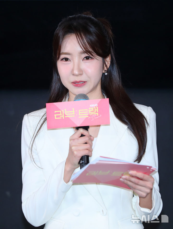 [서울=뉴시스] 김혜진 기자 = 이윤정 아나운서가 11일 오후 서울 영등포구 CGV영등포에서 열린 KBS2 단막프로젝트 '러브: 트랙' 기자간담회에서 인사말을 하고 있다. 2025.12.11. [email protected]