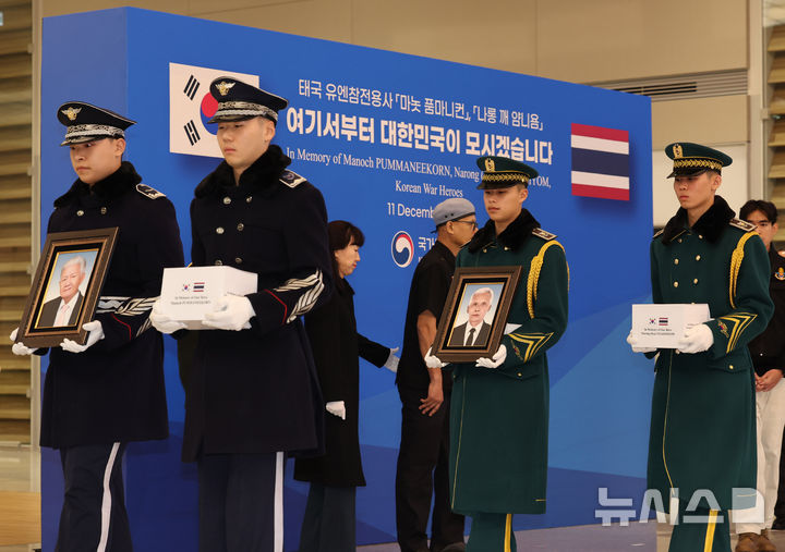[인천공항=뉴시스] 배훈식 기자 = 국군 의장대가 11일 오후 인천국제공항에서 故 마녹 품마니콘, 故 나롱 깨 얌니욤 6.25 전쟁 태국 유엔참전용사 유해를 봉송하고 있다. 2025.12.11. [email protected]