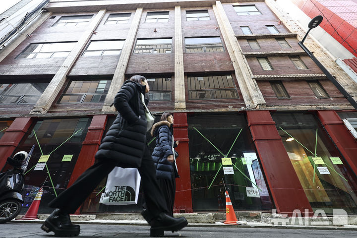 [서울=뉴시스] 김근수 기자 = 12일 서울 명동거리에 위치한 텅 빈 점포 앞으로 시민들이 지나가고 있다.