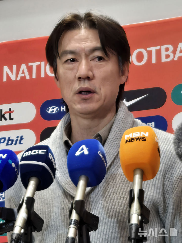 [인천공항=뉴시스] 하근수 기자= 2026 국제축구연맹(FIFA) 북중미 월드컵 조 추첨식과 베이스캠프 후보지 답사를 마친 홍명보 축구 국가대표팀 감독이 12일 오후 인천국제공항 제2여객터미널을 통해 귀국해 취재진 질문에 답변하고 있다. 2025.12.12. [email protected]