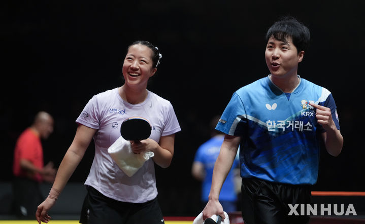 [홍콩=신화/뉴시스] 임종훈과 신유빈이 13일(현지 시간) 중국 홍콩에서 열린 2025 월드테이블테니스(WTT) 홍콩 파이널스 혼합 복식 준결승에서 린스둥-콰이만 조(중국)를 꺾은 후 활짝 웃고 있다. 임종훈-신유빈 조가 3-1(6-11 11-6 11-2 14-12) 역전승을 거두고 결승에 진출해 왕추친-쑨잉사 조(중국)와 우승을 다툰다. 2025.12.13.