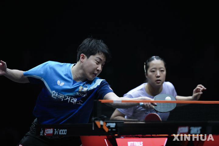 [홍콩=신화/뉴시스] 임종훈과 신유빈이 13일(현지 시간) 중국 홍콩에서 열린 2025 월드테이블테니스(WTT) 홍콩 파이널스 혼합 복식 준결승에서 린스둥-콰이만 조(중국)와 경기하고 있다. 임종훈-신유빈 조가 3-1(6-11 11-6 11-2 14-12) 역전승을 거두고 결승에 진출해 왕추친-쑨잉사 조(중국)와 우승을 다툰다. 2025.12.13.
