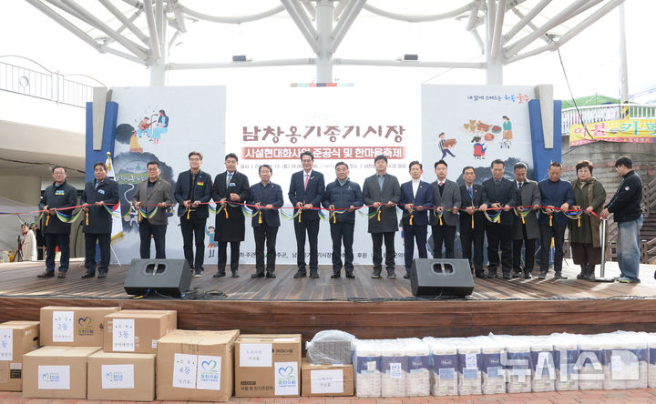 [울산=뉴시스] 배병수 기자 = 13일 울산 울주군 남창시장에서 열린 남창옹기종기시장 시설현대화사업 준공식에서 김두겸(왼쪽 여덟번째)시장, 이순걸 (왼쪽 일곱번째)울주군수 등 참석자들이 축하 테이프를 자르고있다 [email protected].
