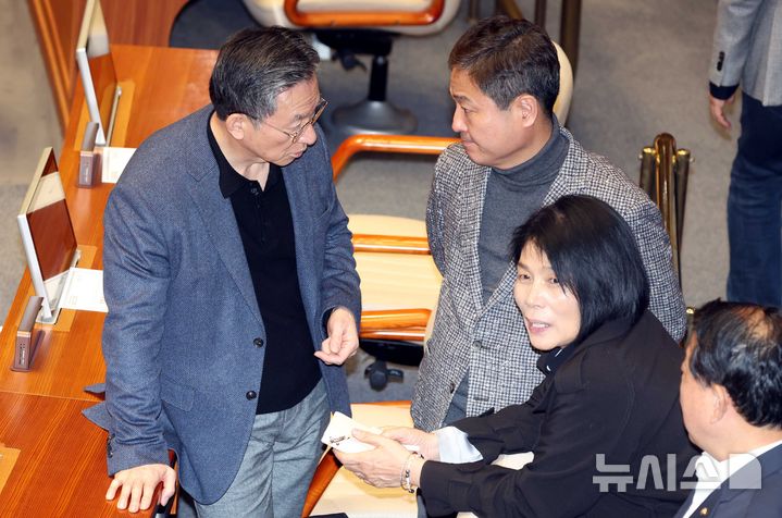 [서울=뉴시스] 조성봉 기자 = 정성호 법무부 장관이 13일 오후 서울 여의도 국회에서 열린 본회의에서 김영배 더불어민주당 의원 등과 대화를 하고 있다. 2025.12.13. [email protected]