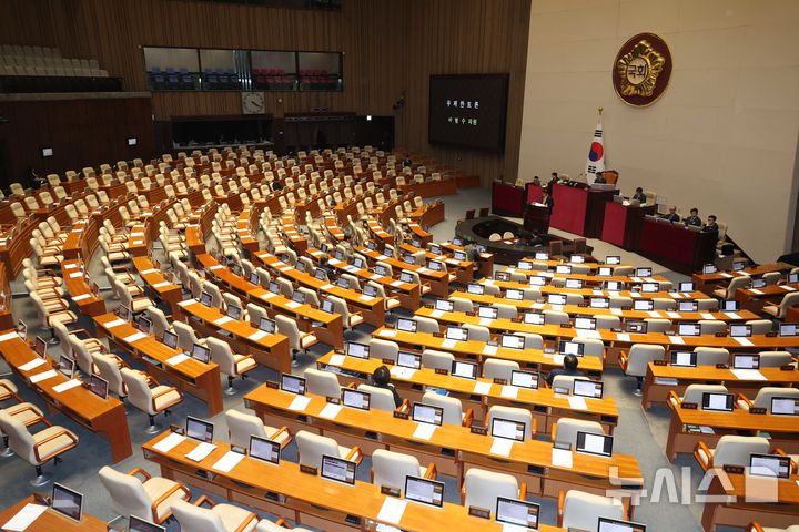 [서울=뉴시스] 조성봉 기자 = 서범수 국민의힘 의원이 13일 오후 서울 여의도 국회에서 열린 본회의에서 경찰관직무집행법 일부개정법률안에 대한 무제한토론(필리버스터)을 하고 있는 가운데 의원들의 빈자리가 눈에 띄고 있다. 2025.12.13. [email protected]