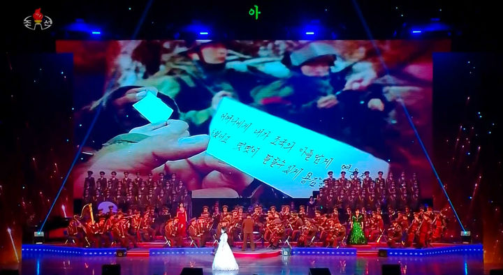 [서울=뉴시스] 북한 조선중앙TV는 13일 김정은 국무위원장이 참석한 가운데 공병부대원들의 귀국을 환영하는 축하공연에서 러시아 파병 공병부대인 제528공병연대의 작전모습 사진을 공개했다. (사진=조선중앙TV 캡처) 2025.12.13. [email protected]