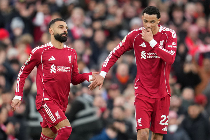 [리버풀=AP/뉴시스] 리버풀의 위고 에키티케(오른쪽)와 모하메드 살라가 13일(현지 시간) 영국 리버풀의 안필드에서 열린 2025-26 EPL 16라운드 브라이튼 앤 호브 알비온과 경기 후반 15분 추가 골을 합작한 후 자축하고 있다. 전반 24분 교체 출전한 살라는 에키티케의 추가 골에 도움을 기록하며 팀의 2-0 승리에 기여했다. 2025.12.14.