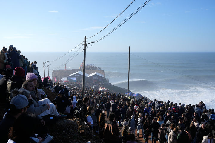 [나자레=AP/뉴시스] 13일(현지 시간) 포르투갈 나자레의 노스 비치에서 ‘나자레 빅웨이브 챌린지’ 서핑 대회가 열린 가운데 해변이 내려다보이는 절벽 위에 모인 사람들이 서퍼들의 경기를 지켜보고 있다. 2025.12.14.