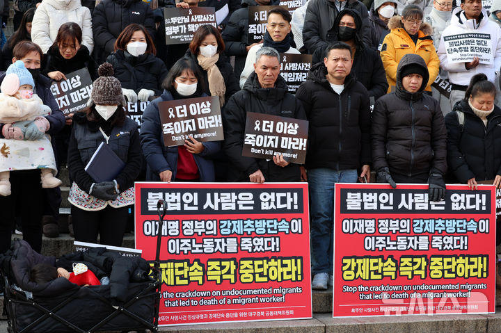 [서울=뉴시스] 이영환 기자 = 14일 오후 서울 용산구 서울역 앞에서 열린 2025 세계 이주노동자의 날 기념 전국이주노동자대회에서 참석자들이 묵념을 하고 있다. 2025.12.14. [email protected]