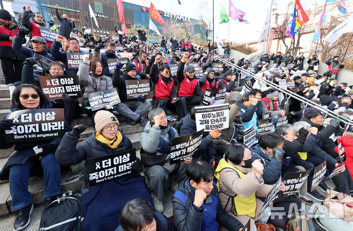 [서울=뉴시스] 이영환 기자 = 14일 오후 서울 용산구 서울역 앞에서 열린 2025 세계 이주노동자의 날 기념 전국이주노동자대회에서 참석자들이 구호를 외치고 있다. 2025.12.14. [email protected]