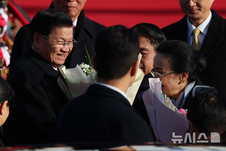 [성남=뉴시스] 권창회 기자 = 통룬 시술릿 라오스 국가주석 내외가 14일 오후 경기 성남시 서울공항을 통해 방한해 꽃다발을 받고 있다. 2025.12.14. [email protected]
