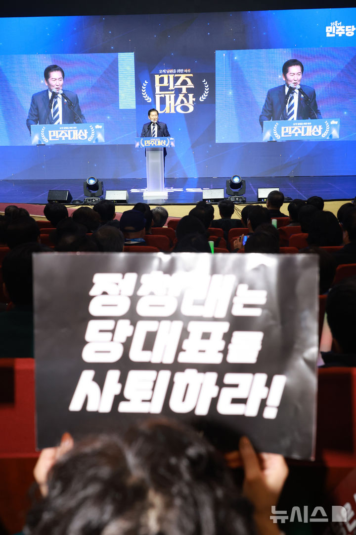 [서울=뉴시스] 고승민 기자 = 정청래 더불어민주당 대표가 14일 서울 여의도 국회 의원회관에서 열린 창당 70주년 기념 당원의 날 행사 '민주대상'에서 축사를 하는 동안 한 참가자들이 내란재판특별법 제정 및 당대표 사퇴를 촉구하는 피켓을 들고 있다. 2025.12.14. [email protected]