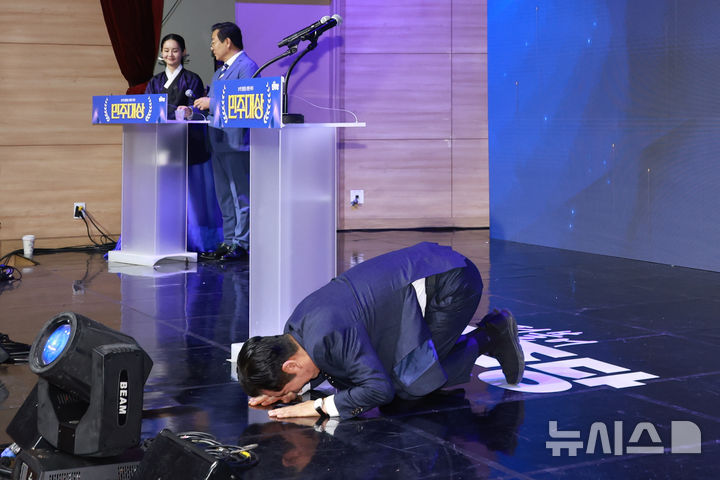 [서울=뉴시스] 고승민 기자 = 정청래 더불어민주당 대표가 14일 서울 여의도 국회 의원회관에서 열린 창당 70주년 기념 당원의 날 행사 '민주대상'에서 축사를 하던 중 큰절을 하고 있다. 2025.12.14. [email protected]
