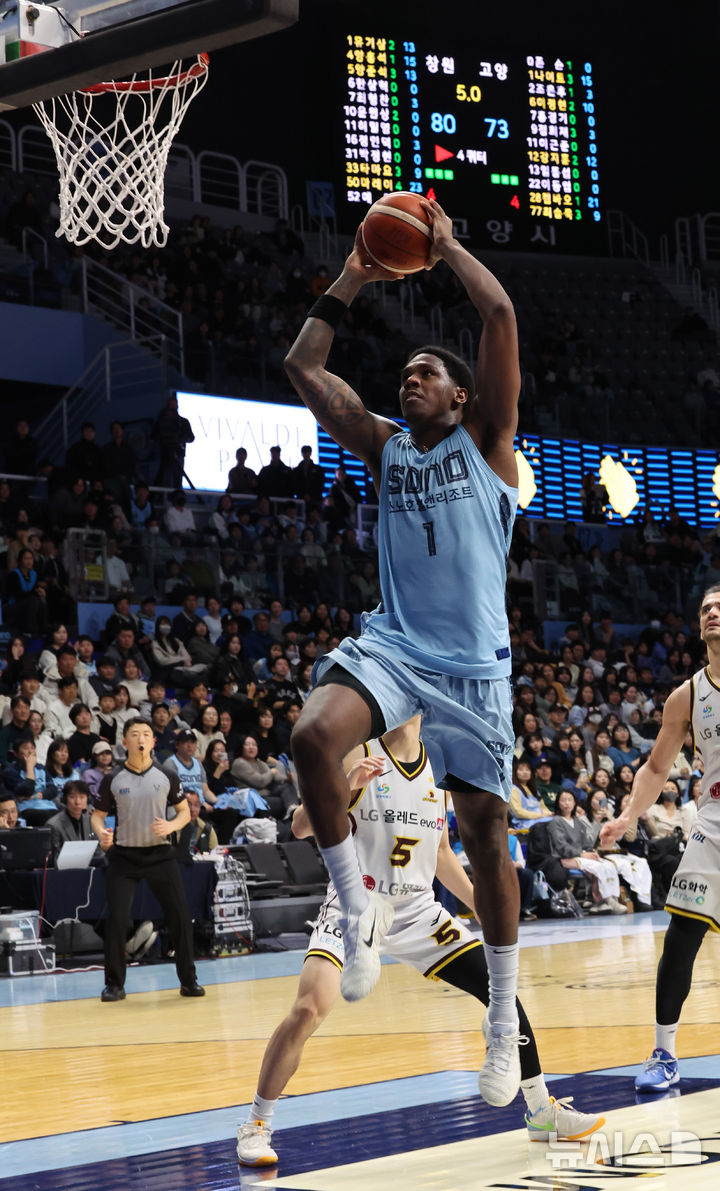 [고양=뉴시스] 배훈식 기자 = 14일 오후 경기 고양시 고양 소노 아레나에서 열린 2025~2026시즌 LG전자 프로농구 고양 소노와 창원 LG의 경기, 4쿼터 소노 나이트가 덩크슛을 하고 있다. 2025.12.14. [email protected]
