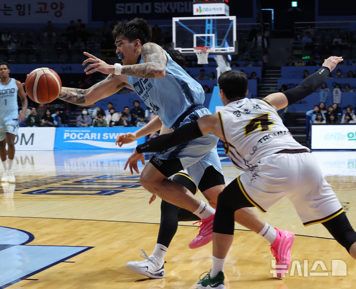 [고양=뉴시스] 배훈식 기자 = 14일 오후 경기 고양시 고양 소노 아레나에서 열린 2025~2026시즌 LG전자 프로농구 고양 소노와 창원 LG의 경기, 4쿼터 소노 켐바오가 돌파하고 있다. 2025.12.14. [email protected]